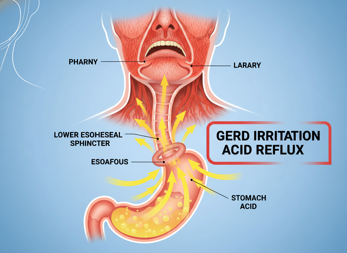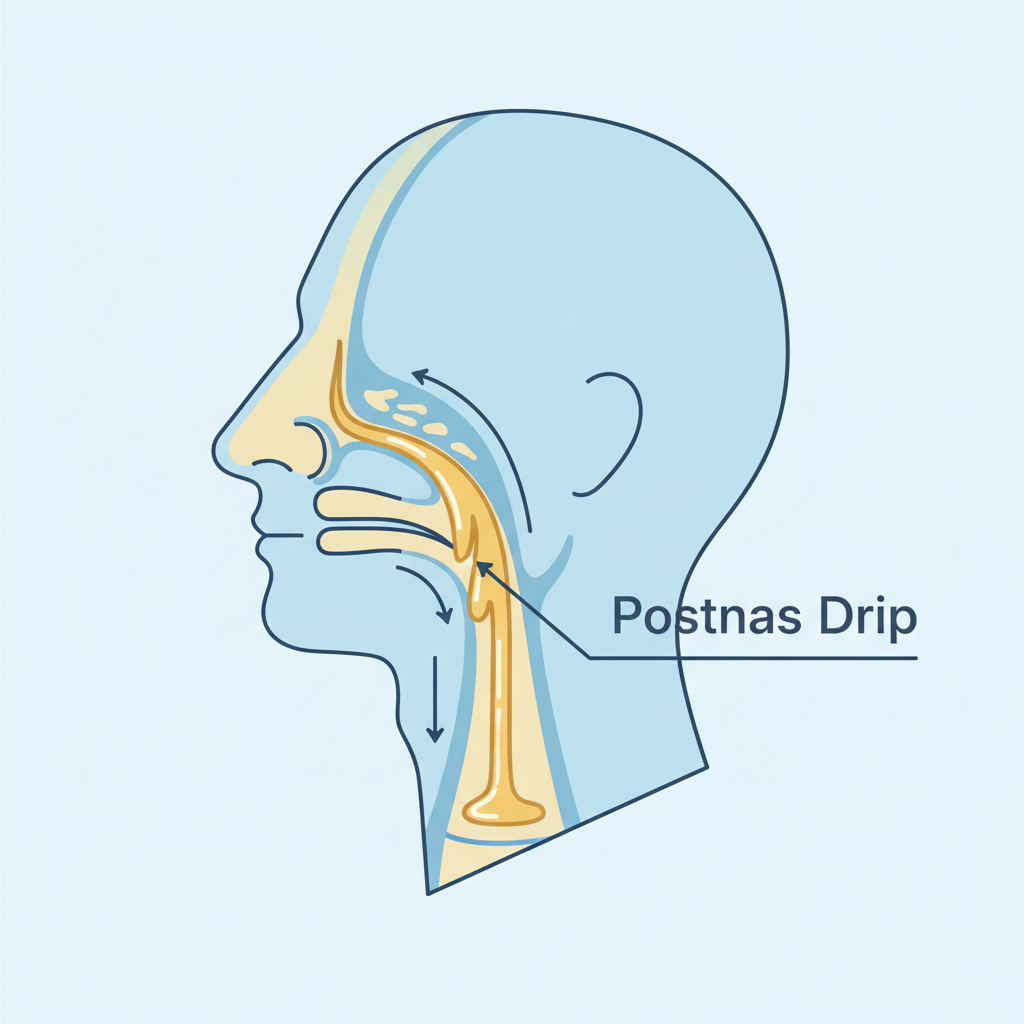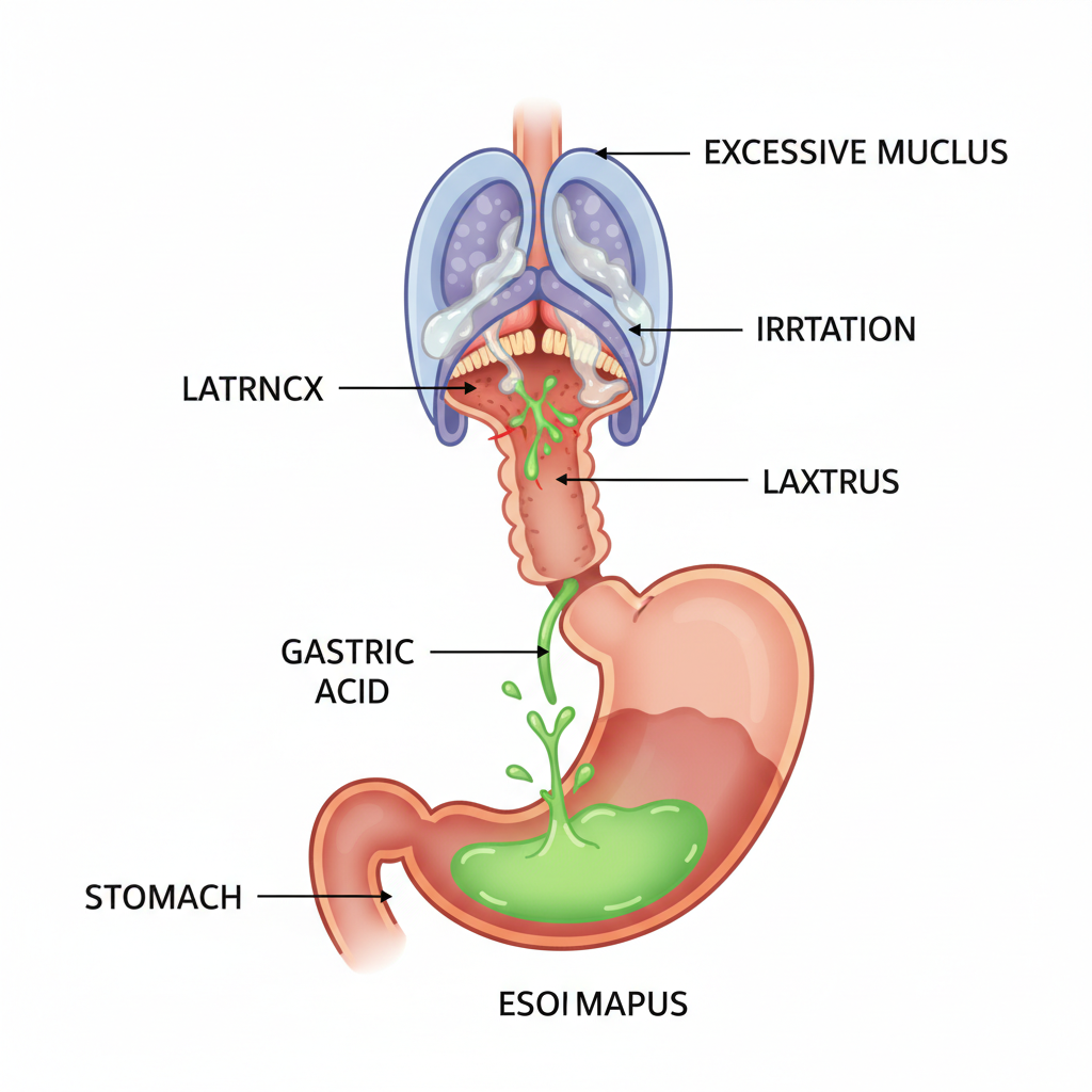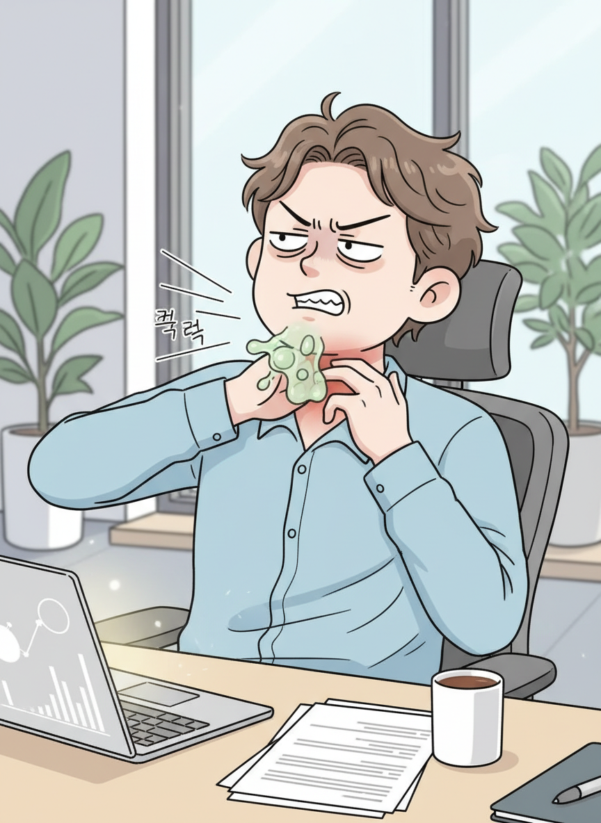 - 역류성 식도염 (인후두 역류질환): "저는 속은 안 쓰린데요?"라고 반문하실 수 있습니다. 하지만 위산이 식도를 타고 목까지 올라와 인후두를 자극하면, 목은 점막을 보호하기 위해 필사적으로 점액을 뿜어냅니다. 목에 무언가 걸린 듯한 '매핵기' 증상이 대표적이며, 헛기침을 자주 하게 됩니다.