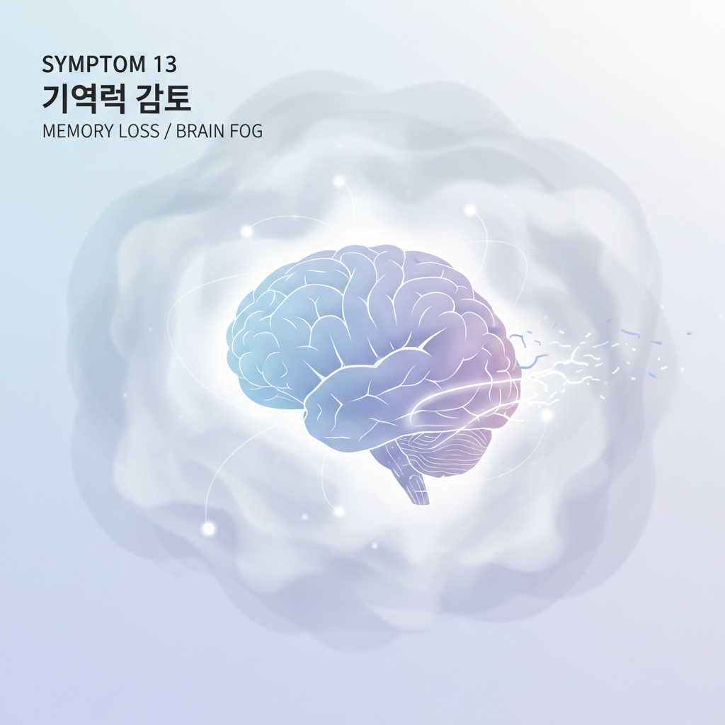 - 13. 기억력 감퇴: 물건을 둔 장소를 잊거나 단어가 금방 떠오르지 않는 '브레인 포그' 현상입니다.