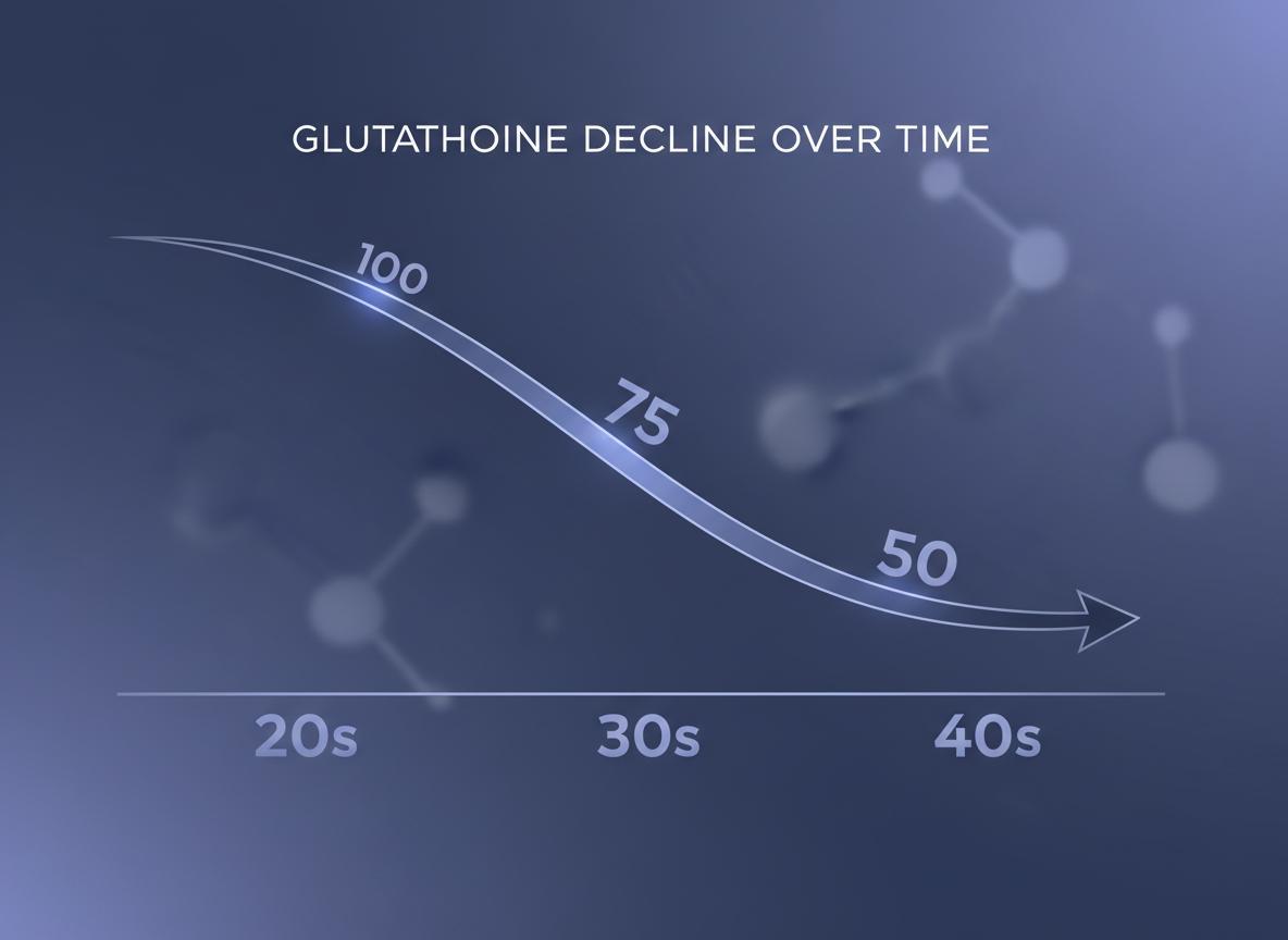 안타깝게도 글루타치온은 20대 이후부터 매 10년마다 약 15%씩 감소하게 됩니다. 노화가 진행될수록 외부로부터의 보충이 점점 중요해지는 이유가 바로 여기에 있죠.