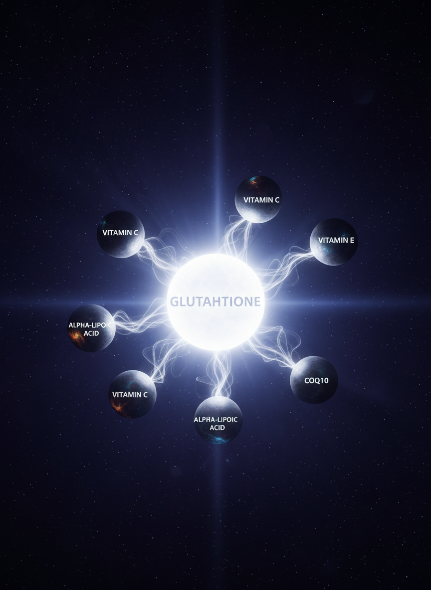 글루타치온은 우리 몸의 모든 세포에서 생성되는 천연 항산화 성분입니다. 세 가지 아미노산(글루탐산, 시스테인, 글리신)이 결합한 형태인데요. 수많은 항산화제 중에서도 **'마스터 항산화제'**라 불리는 이유는 다른 항산화제(비타민 C, E 등)가 제 역할을 다한 뒤 다시 활성화될 수 있도록 돕는 역할을 하기 때문입니다.