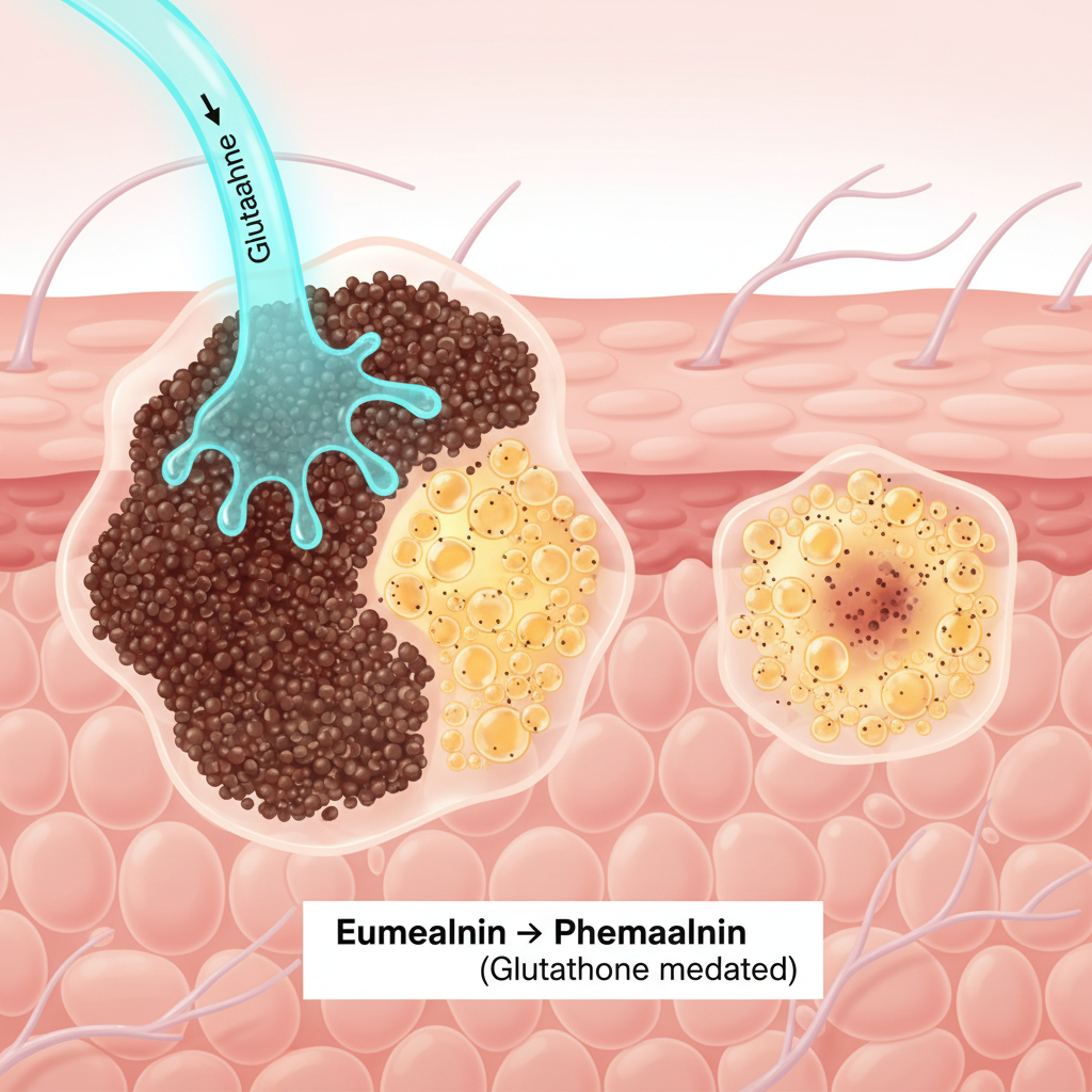 글루타치온이 '백옥 주사'의 성분으로 유명해진 이유는 바로 **멜라닌 색소 형성 억제** 능력 때문입니다. 우리 피부를 어둡게 만드는 갈색 멜라닌을 밝은 색 멜라닌(페오멜라닌)으로 전환시켜 줍니다.