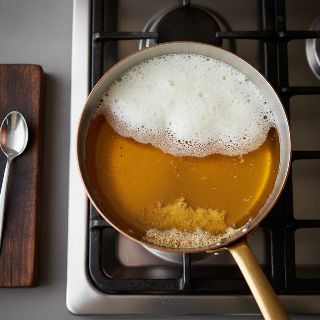 기버터는 무염 버터를 서서히 가열하여 수분과 유당, 단백질(카제인)을 모두 제거한 정제 버터(Clarified Butter)의 한 종류입니다. 인도에서 수천 년 전부터 사용되어 온 이 황금빛 오일은 가열 과정에서 고소한 견과류 향이 입혀지며, 일반 버터보다 훨씬 농축된 영양을 자랑합니다.