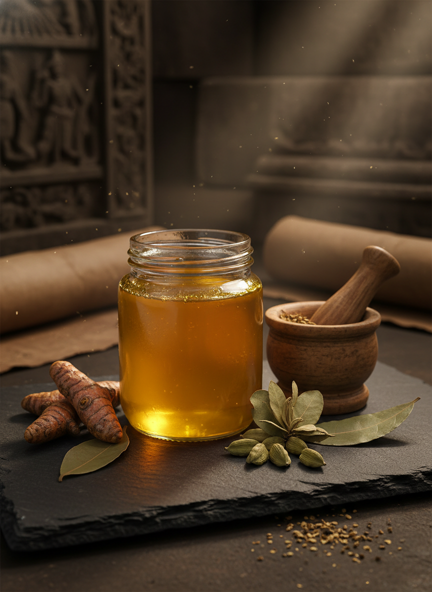 산스크리트어에서 유래한 명칭으로, 버터를 단순히 녹이는 것을 넘어 수분이 완전히 증발할 때까지 충분히 끓여 지방의 순도를 극대화한 상태를 의미합니다.