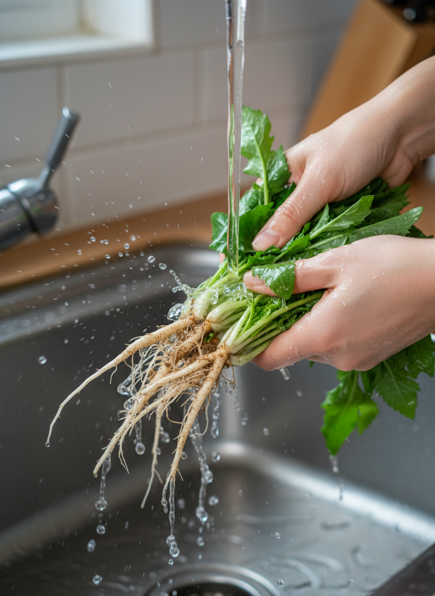 - 누런 잎을 떼어내고 뿌리와 잎 사이의 이물질을 칼로 긁어냅니다.