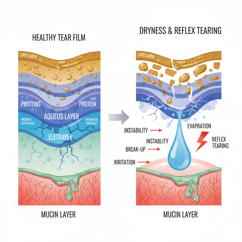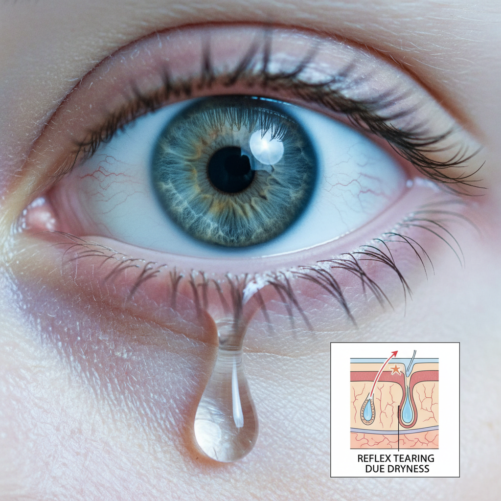 A2: 안구건조증으로 눈 표면이 충분히 촉촉하지 못하면, 우리 몸은 건조함을 보상하기 위해 반사적으로 눈물을 과도하게 분비합니다. 이 눈물은 일시적이며, 눈의 필수적인 윤활 작용과는 차이가 있다는 것을 기억해주세요.