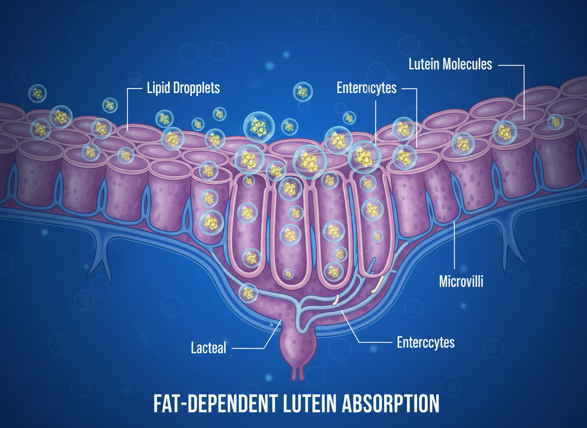 왜냐하면 루테인은 지용성 영양소이기 때문이에요. 지용성이라는 것은 쉽게 말해 기름과 친하다는 뜻이죠. 우리 몸에서 지용성 영양소가 잘 흡수되려면 지방이 필요합니다. 음식을 통해 섭취한 지방이 루테인의 흡수를 돕는 역할을 하는 거죠.