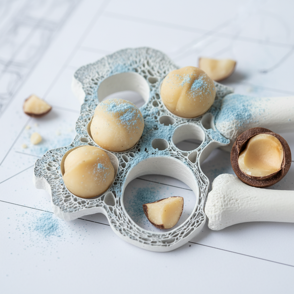 마카다미아는 칼슘, 마그네슘, 인 등 뼈 건강에 필수적인 미네랄을 함유하고 있어 뼈를 튼튼하게 하고 골다공증 예방에 기여합니다. 성장기 어린이부터 중장년층까지 좋은 영양원이 될 수 있어요.