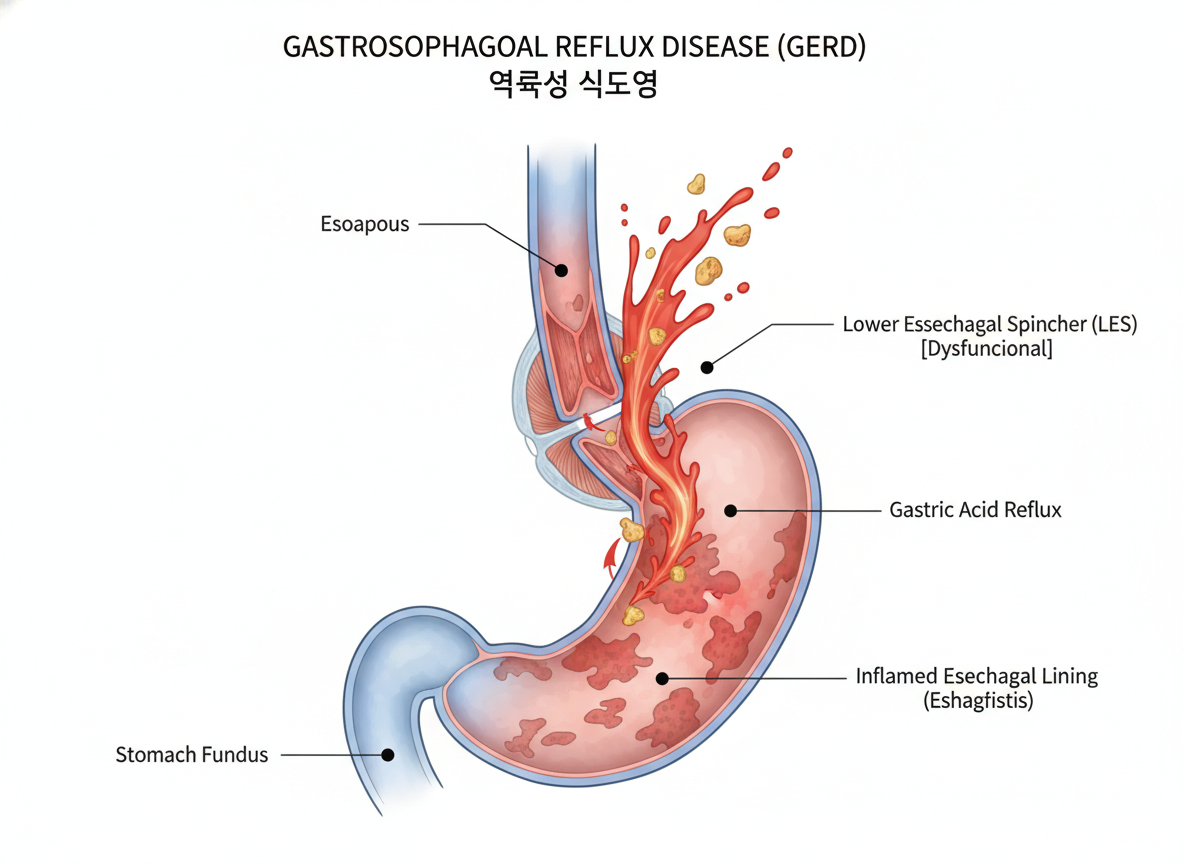 - 역류성 식도염: 위산 역류로 가슴 타는 듯한 통증, 신물 넘어옴, 목 이물감 등이 생겨요. 밤에 더 심해지는 경향이 있죠.