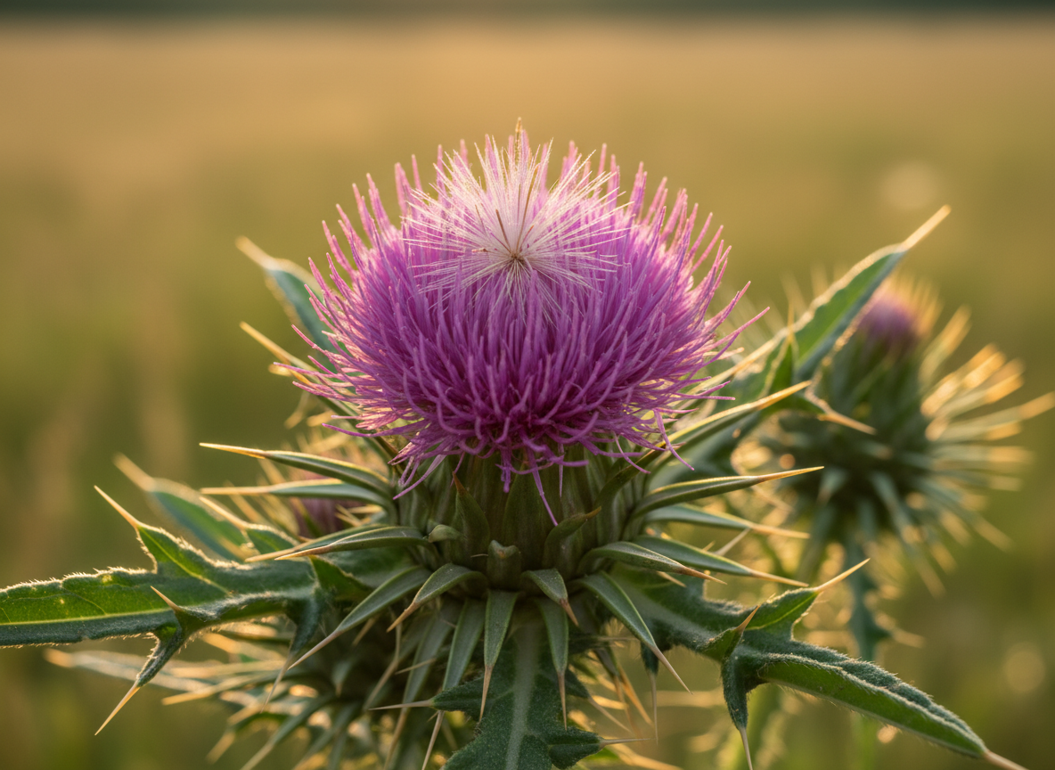 밀크씨슬은 보라색 꽃을 피우는 엉겅퀴의 일종입니다. 잎을 짓이겼을 때 우유처럼 하얀 즙이 나온다고 해서 이런 이름이 붙었죠. 이 식물의 씨앗 속에는 '실리마린(Silymarin)'이라는 아주 강력한 항산화 성분이 들어있습니다.
