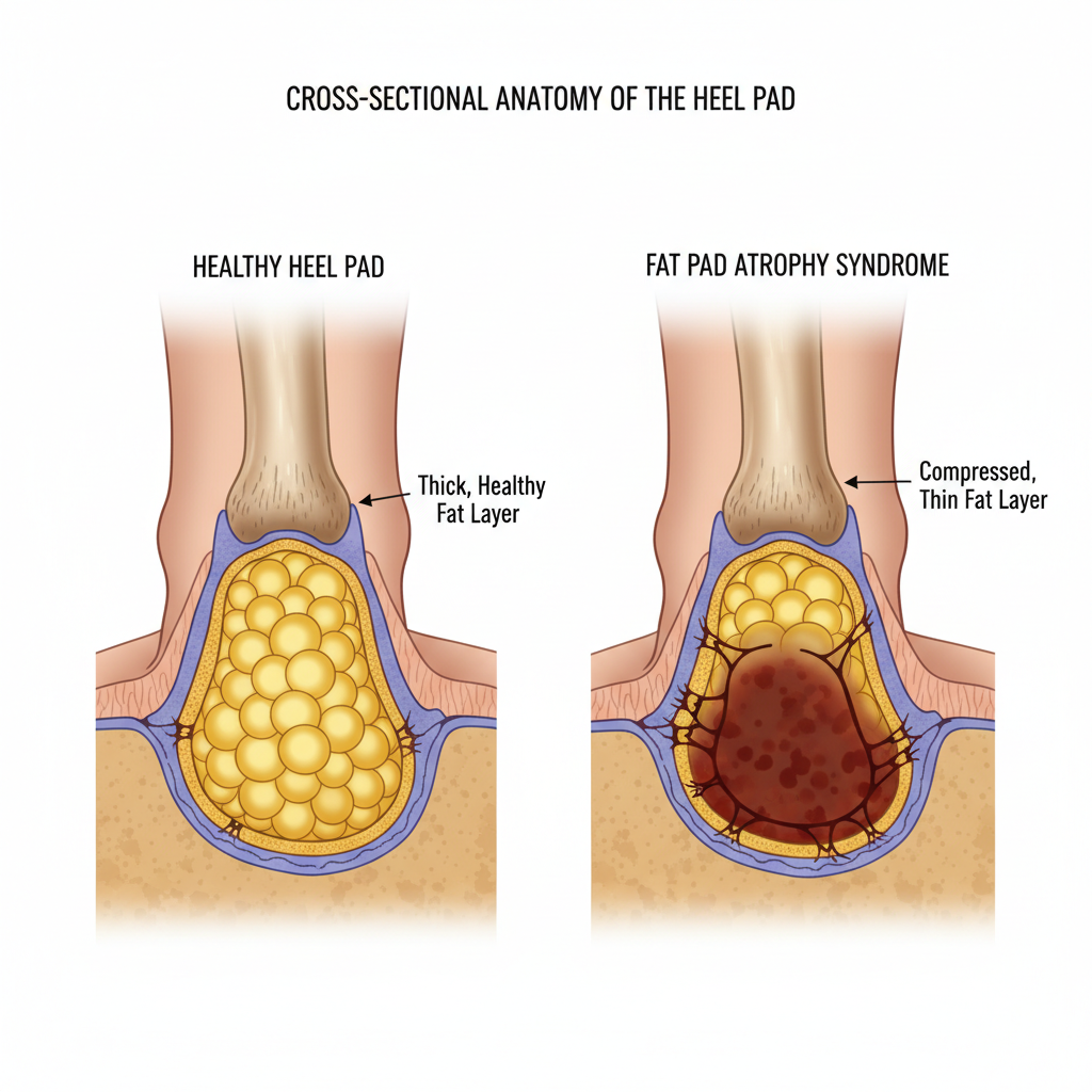 또 하나는 조금 생소할 수 있는 '지방패드 증후군'이에요. 우리 뒤꿈치에는 충격 흡수용 지방층이 있는데, 나이가 들거나 심한 충격을 반복해서 받으면 이 패드가 얇아지면서 뼈가 지면에 닿는 듯한 통증을 느끼게 됩니다.