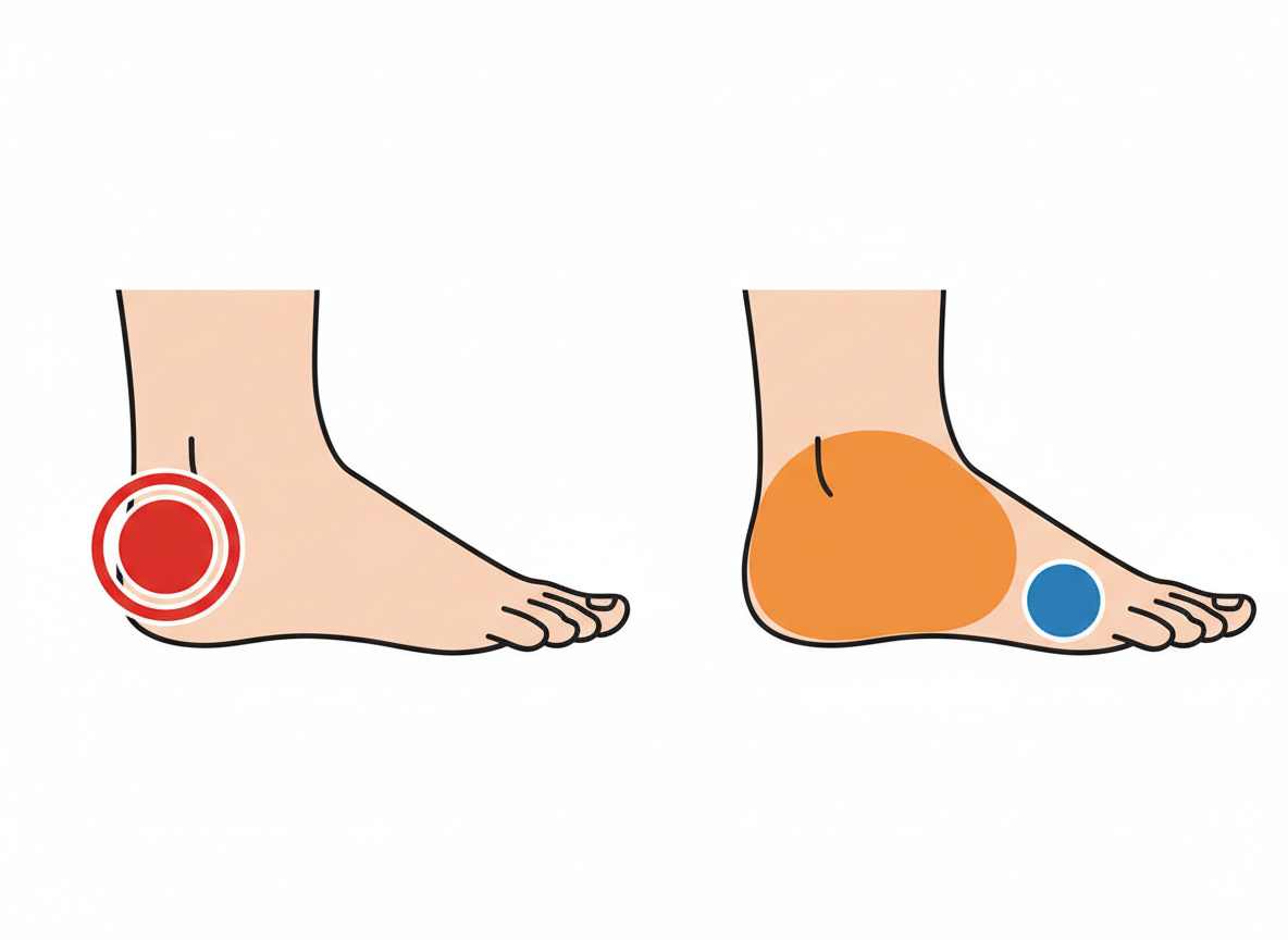 통증 부위가 발뒤꿈치 중에서도 약간 위쪽(뒤쪽)이라면 아킬레스건염을 의심해 봐야 해요. 발꿈치뼈 뒷부분에 붙어 있는 굵은 힘줄에 염증이 생긴 건데, 주로 까치발을 들거나 계단을 오를 때 통증이 심해집니다.