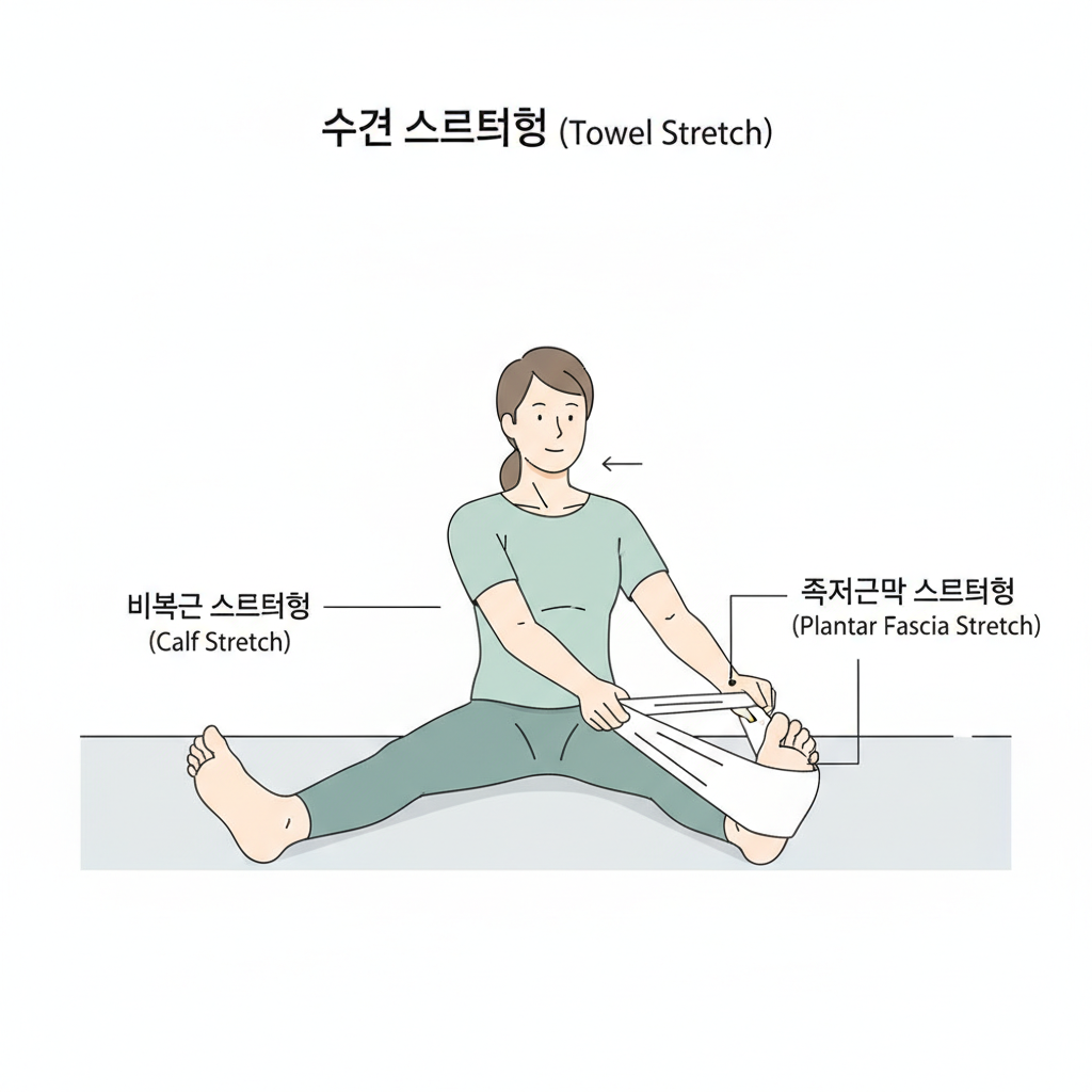 - 원인 파악: 아침 첫발이 아프면 족저근막염, 뒤쪽이 아프면 아킬레스건염을 의심하세요.