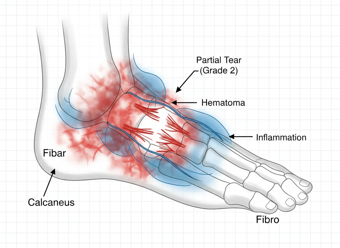 | 2도 염좌 (중간 손상) | 인대가 부분적으로 찢어진(파열된) 상태 | 심한 통증, 붓기, 멍이 들며 절뚝거리게 됨 |