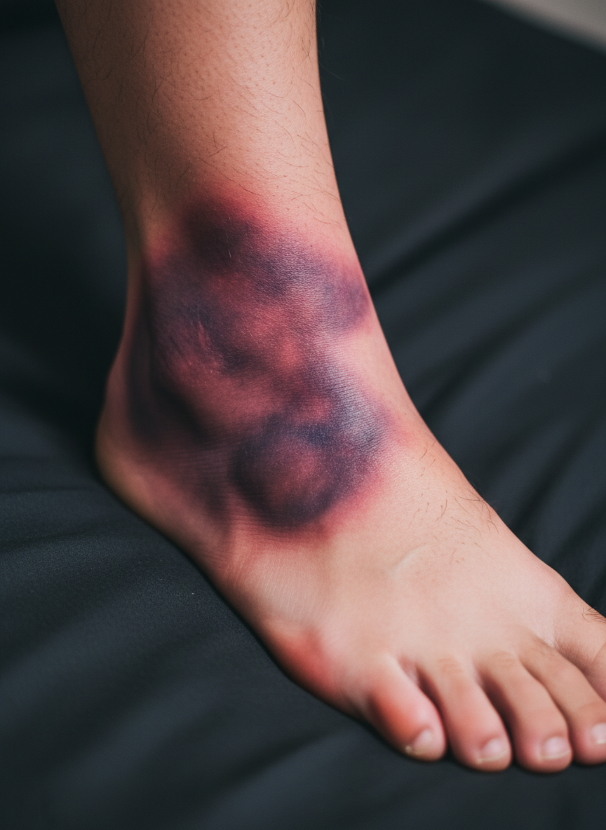 - 복숭아뼈 주변뿐만 아니라 발등이나 종아리 쪽까지 심하게 붓고 피멍이 심하다.