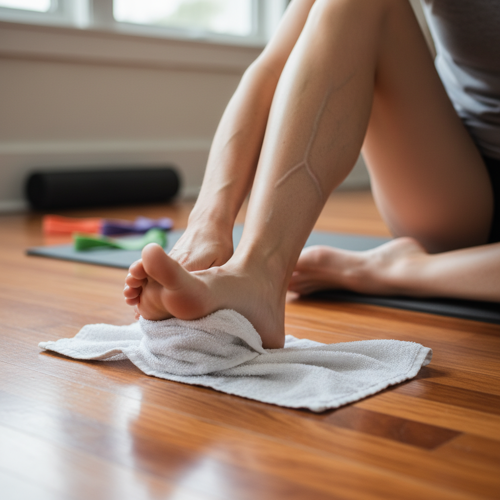 - 수건 끌어당기기 (근력 강화): 바닥에 수건을 깔고 맨발로 앉은 뒤, 발가락 힘만으로 수건을 움켜쥐어 내 쪽으로 끌어당기는 운동을 반복하세요. 발바닥과 발목 주변의 미세 근육을 튼튼하게 만들어 줍니다.