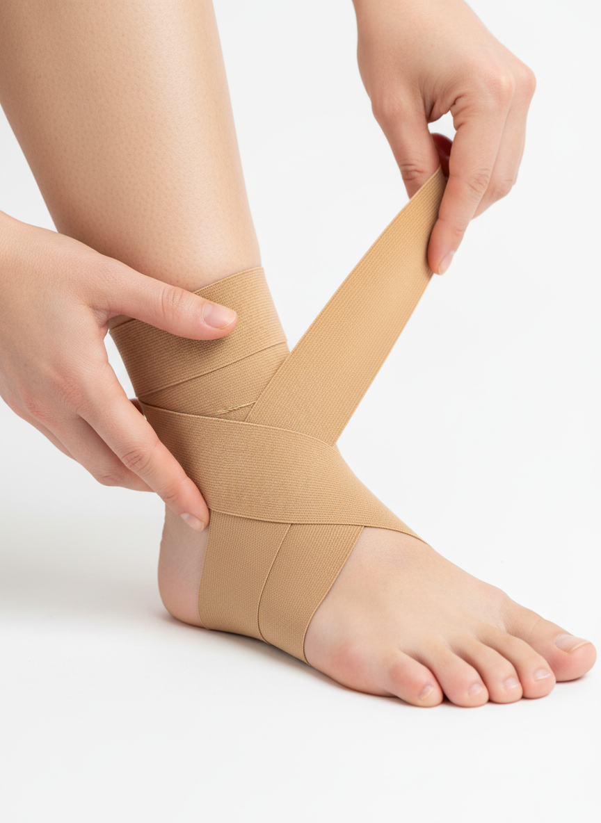 - C (Compression, 압박): 압박 붕대나 스포츠 테이핑을 이용해 다친 발목을 적당한 압력으로 감아주세요. 붓기가 퍼지는 것을 막고 관절을 단단하게 고정해 줍니다. 단, 피가 통하지 않을 정도로 너무 꽉 조이면 안 돼요!