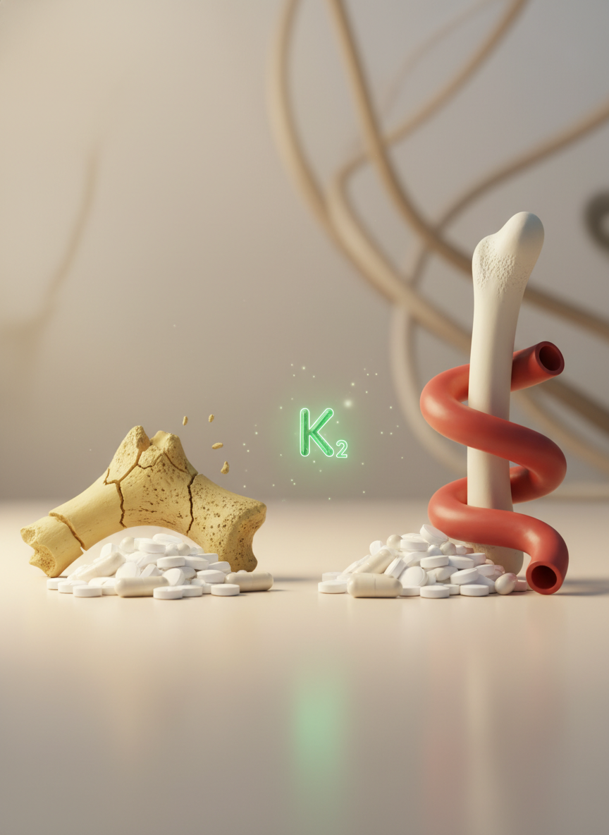 여러분도 아마 이런 의문을 가져본 적 있을 거예요. '칼슘을 그렇게 열심히 챙겨 먹는데, 왜 뼈는 자꾸 약해지고 혈관은 딱딱해질까?' 이른바 '칼슘의 역설'이라고 불리는 현상인데요. 그 답의 열쇠를 바로 비타민 K2가 쥐고 있답니다. 비타민 K2는 우리 몸속에서 칼슘이 제자리를 찾아가도록 돕는 교통경찰 같은 역할을 해요. 즉, 섭취한 칼슘이 뼈와 치아로 제대로 흡수되도록 촉진하고, 동시에 혈관이나 연조직 같은 엉뚱한 곳에 침착되어 문제를 일으키는 것을 막아주는 거죠. 정말 똑똑한 영양소 아닌가요?