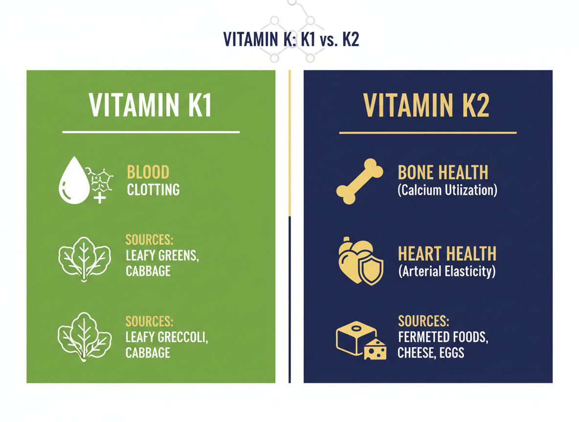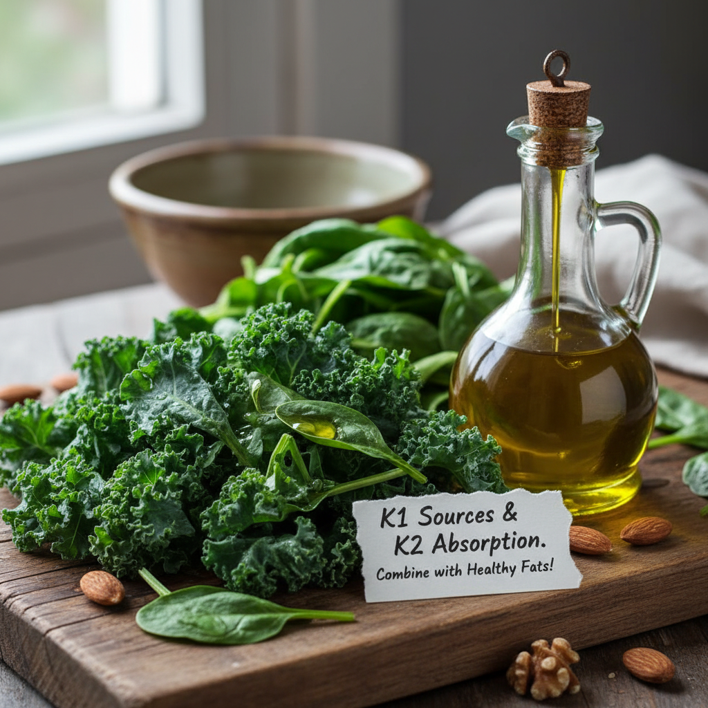A1: 비타민 K1은 주로 녹색 잎채소에 많으며 혈액 응고에 중요한 역할을 합니다. 반면 비타민 K2는 발효 식품(낫또, 특정 치즈)이나 동물성 식품(목초 먹인 육류)에 많으며, 칼슘이 뼈와 치아로 제대로 흡수되고 혈관에 침착되는 것을 막아 뼈 및 심혈관 건강에 기여합니다. 기능과 공급원이 다르다고 이해하시면 됩니다.