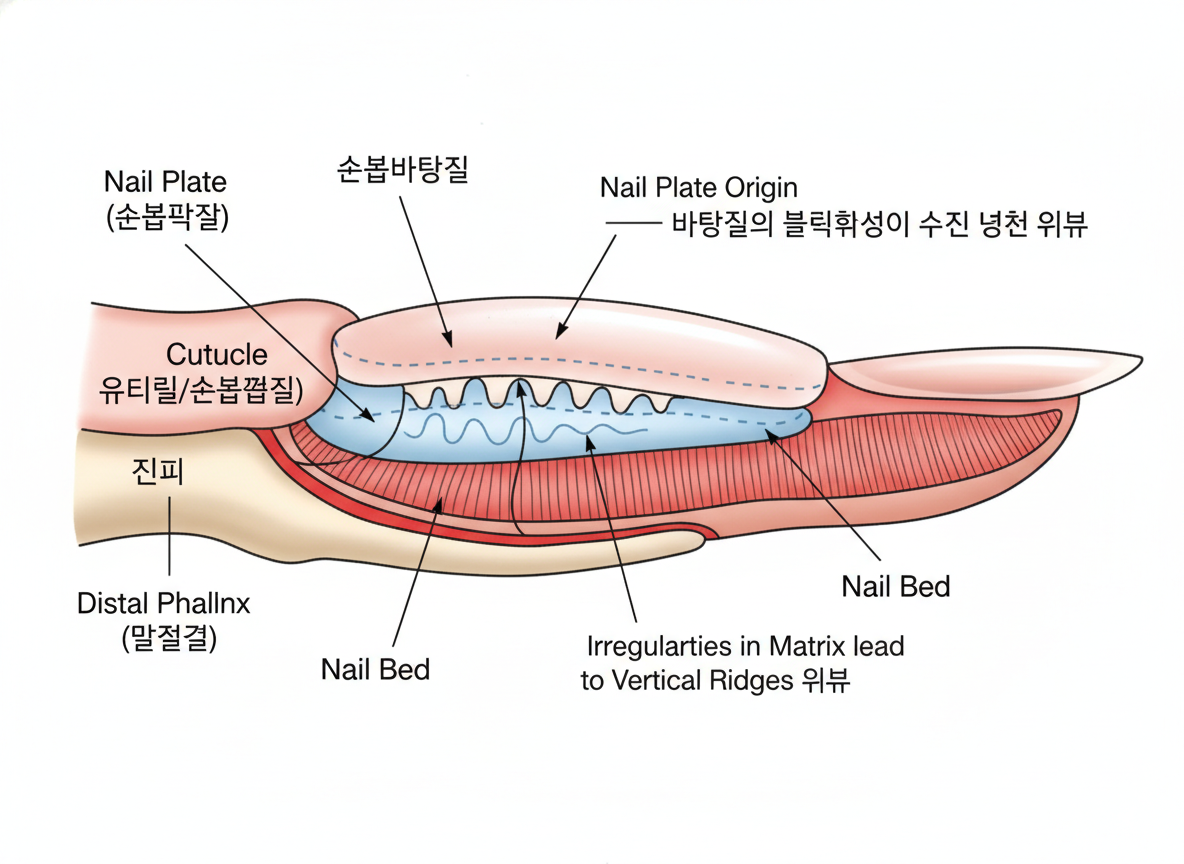 우리 피부에 주름이 생기듯이 손톱도 나이가 들면서 자연스럽게 변화해요. 손톱이 자라는 뿌리 부분인 손톱바탕질(Nail Matrix)의 세포 생성 활동이 예전 같지 않아지면서 미세한 굴곡이 생기게 되는 거죠. 마치 나무의 나이테처럼 말이죠. 40대 이후부터는 많은 분들에게 나타나는 현상이라, 저도 거울 볼 때마다 “음, 세월의 흔적이란 이런 건가?” 하고 생각하곤 한답니다.