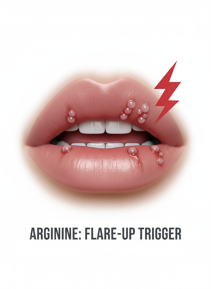 가장 먼저 짚고 넘어가야 할, 그리고 가장 흔하게 발생하는 부작용은 바로 바이러스성 피부 질환의 악화입니다. 평소 조금만 피곤하면 입술 주위에 물집이 잡히는 분들, 즉 헤르페스 바이러스 보균자라면 아르기닌 섭취는 정말 신중해야 합니다. 우리 몸속의 헤르페스 바이러스는 평소에는 얌전히 잠복해 있다가, 특정 조건이 갖춰지면 폭발적으로 증식합니다. 이때 바이러스가 복제하고 증식하는 데 가장 필요한 '먹이'가 바로 아르기닌입니다.