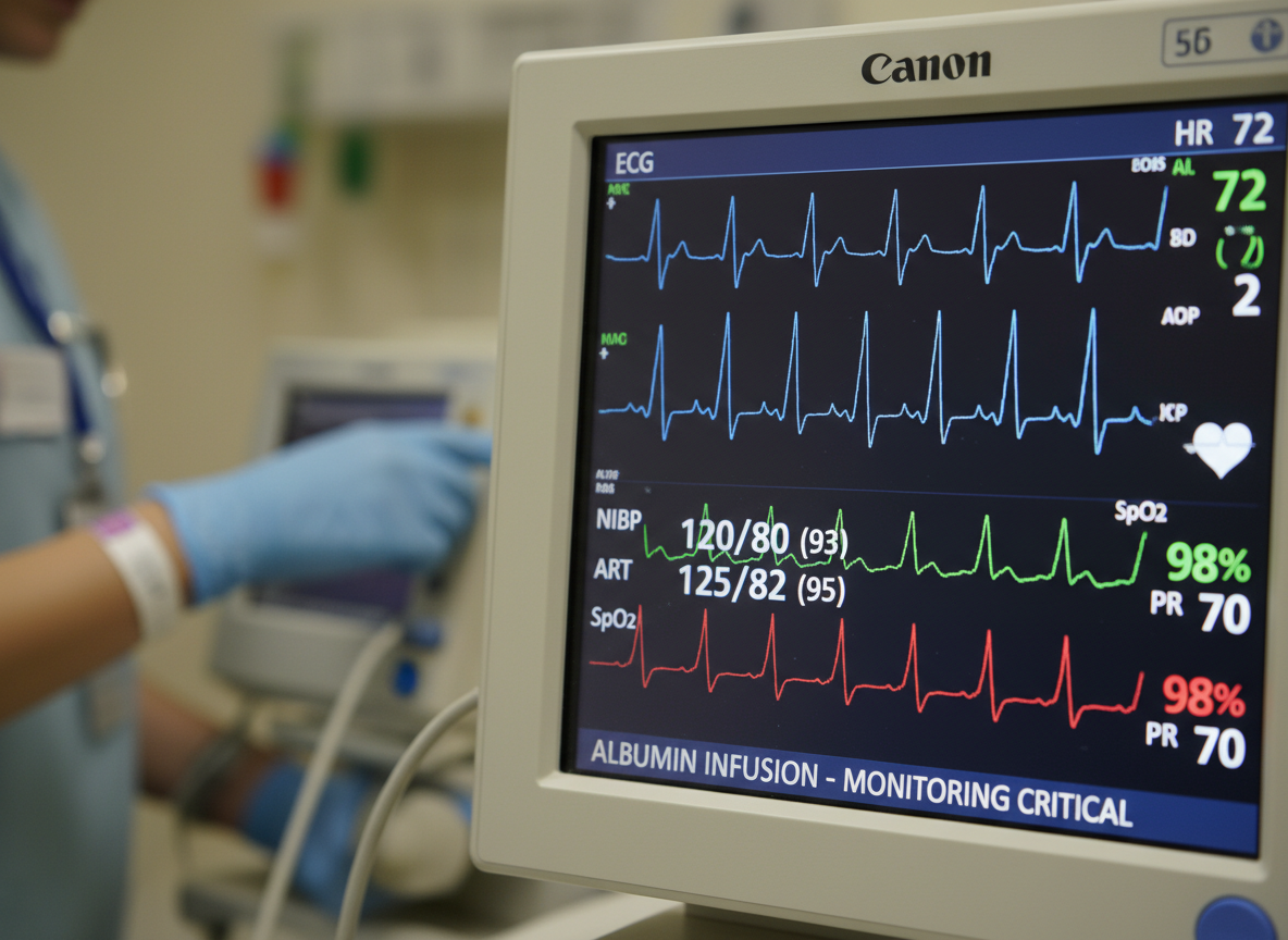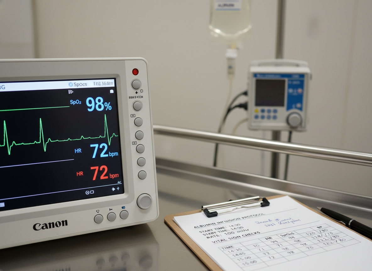 알부민은 고농도 단백질 수액이므로 투여 속도가 매우 중요합니다. 보통 성인 기준 분당 2~4ml 이하로 천천히 주입하며, 환자의 상태에 따라 의료진이 엄격하게 조절합니다. 본인이 답답하다고 임의로 속도를 높이는 일은 절대 없어야 합니다!