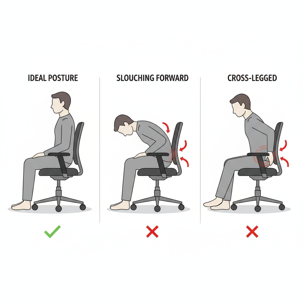 A3: 오래 앉아있는 자세 자체가 엉덩이 근육을 약화시키고 굳게 만들 수 있습니다. 특히 다리를 꼬고 앉거나, 한쪽 엉덩이에 체중을 싣는 비스듬한 자세, 그리고 허리가 굽은 자세는 골반과 엉덩이 근육에 큰 부담을 주어 통증을 유발하거나 악화시킬 수 있어요.