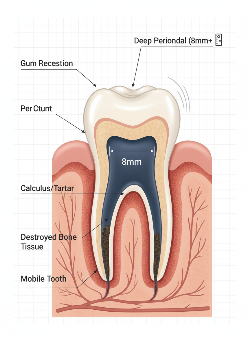| 염증 범위 | 연조직(잇몸)에만 국한됨 | 잇몸뼈(치조골)까지 파괴됨 |