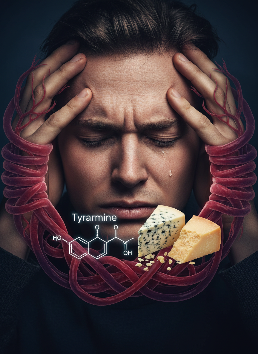 티라민은 단백질이 분해되면서 생기는 아민의 일종으로, 혈관을 수축시켰다가 다시 급격히 확장시키는 작용을 합니다. 이 과정에서 뇌혈관이 팽창하며 욱신거리는 편두통을 유발할 수 있습니다. 특히 항우울제를 복용 중인 환자의 경우, 약물이 티라민 분해 효소를 억제하여 혈압이 급상승하는 위험한 상황(치즈 효과, Cheese Effect)이 발생할 수 있으므로 숙성 치즈 섭취에 각별한 주의가 요구됩니다.