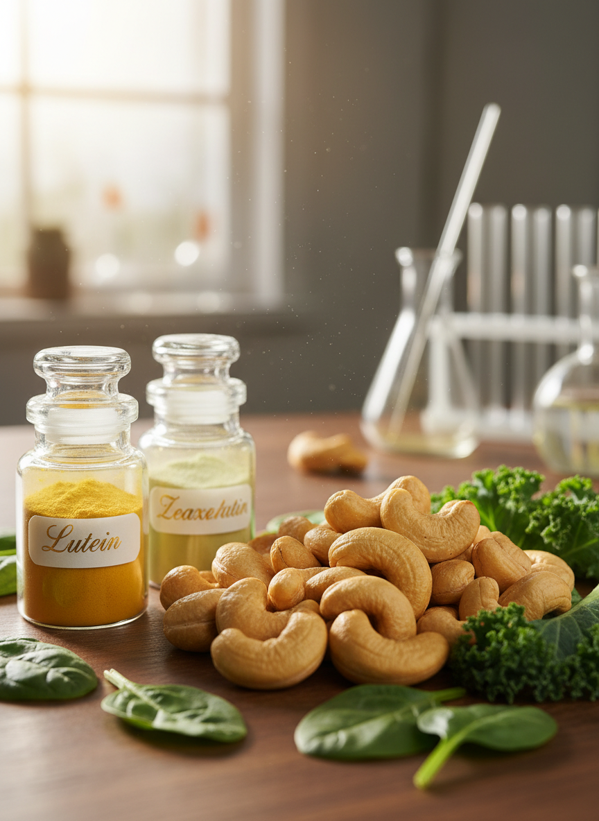 캐슈넛에는 현대인에게 꼭 필요한 **눈 건강 성분**이 들어있습니다. 바로 제아잔틴과 루테인입니다. 이 항산화제들은 망막에 직접적으로 작용하여 자외선으로부터 눈을 보호하고 노년기 황반변성 예방에 도움을 줍니다.